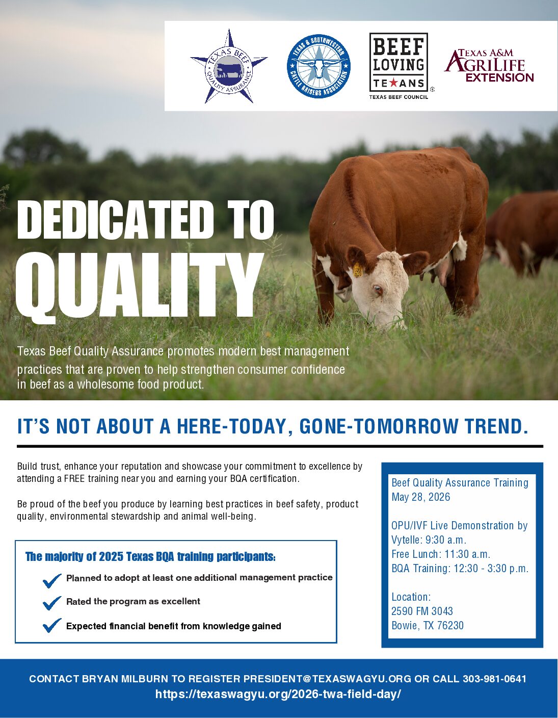 Join us in Floydada, Texas on February 24th and become BQA certified for FREE! Topics Include: Residue Avoidance – Vaccine Handling – Proper Injection Technique – Genetic Selection – Environmental Stewardship – Cattle Handling & Welfare. The event will take place at the Floyd County Extension Office Address: 122 E California Street, Floydada, TX 79235 …