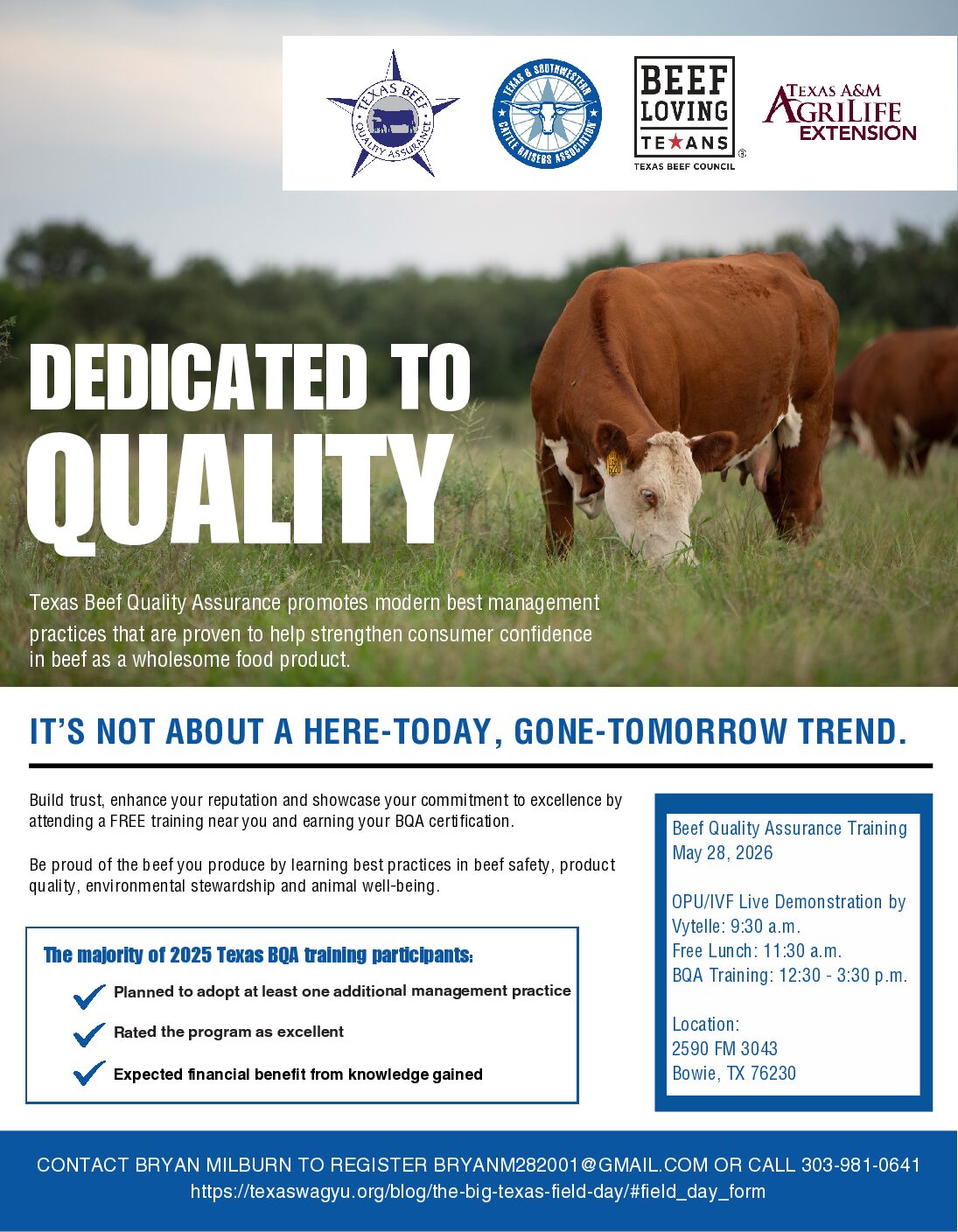 Join us in Bowie, Texas on May 28th and become BQA certified for FREE! Topics Include: Residue Avoidance – Vaccine Handling – Proper Injection Technique – Genetic Selection – Environmental Stewardship – Cattle Handling & Welfare. Address: 2590 FM 3043 Bowie, TX 76230 OPU/IVF Live Demonstration by Vytelle: 9:30 a.m. Free Lunch: 11:30 a.m. BQA …
